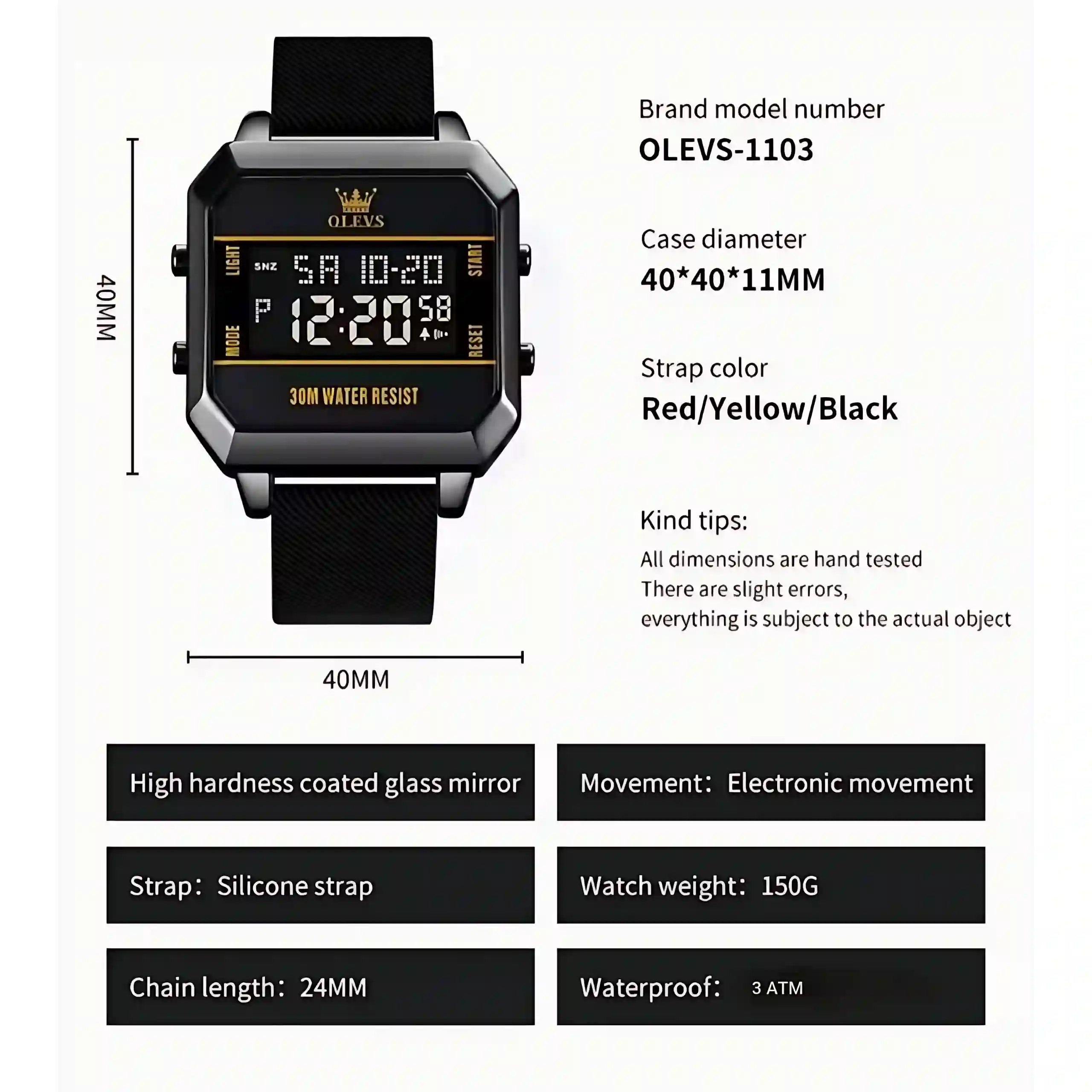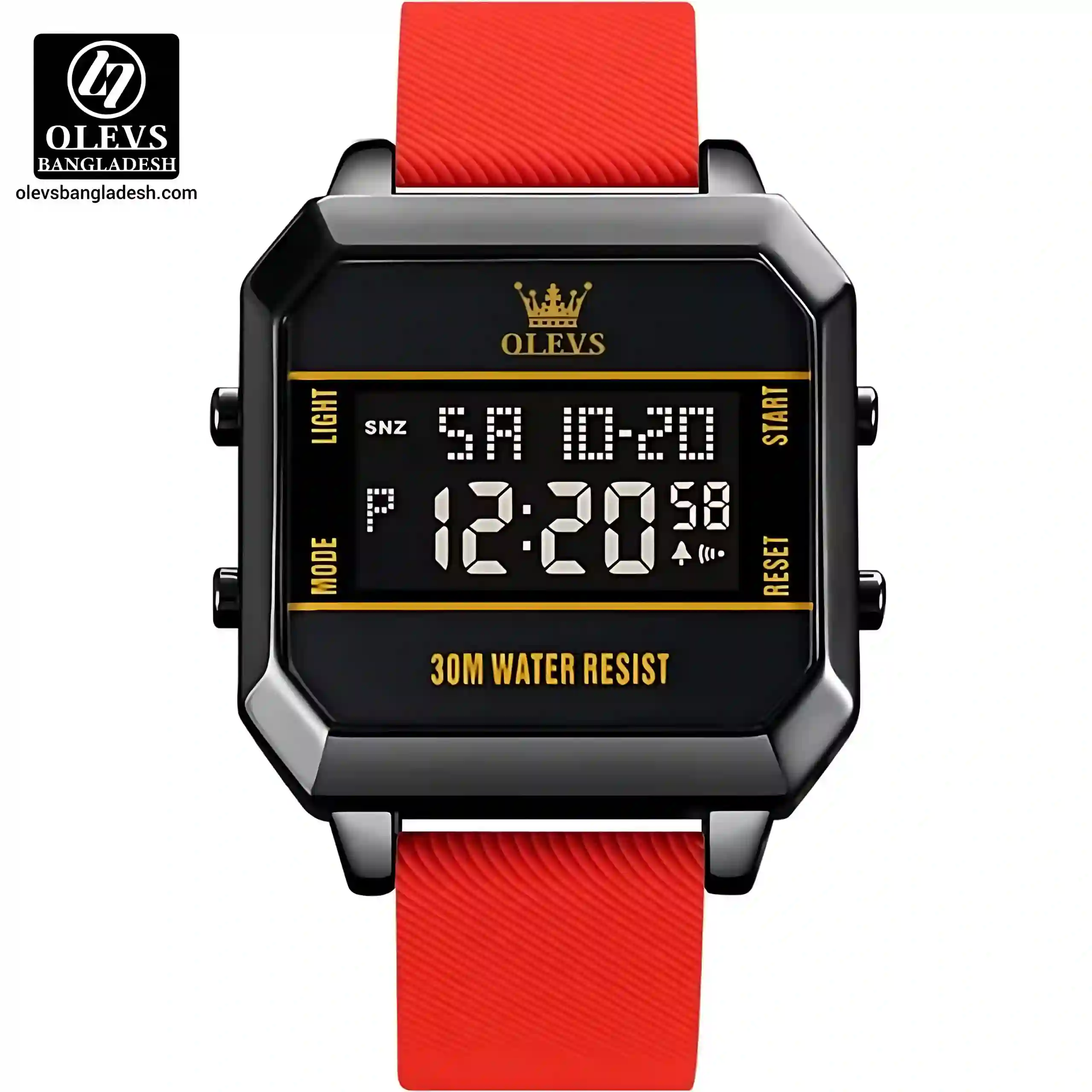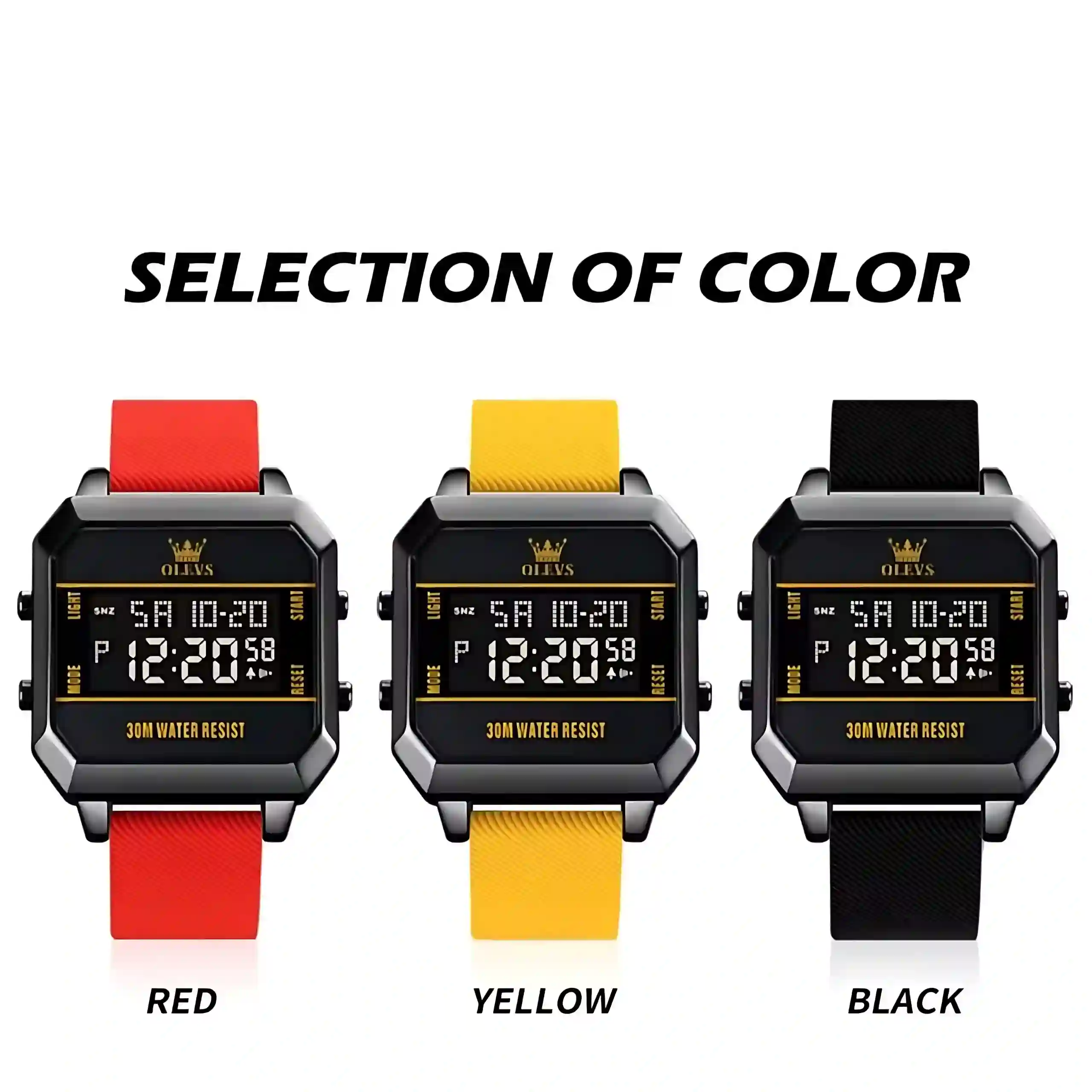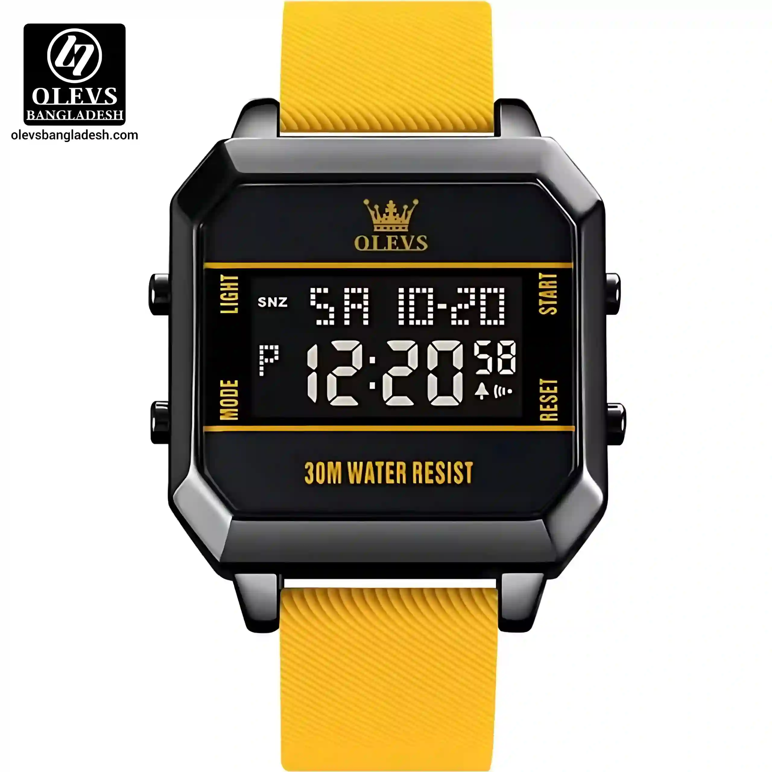 The Olevs 1103 Men Watch is a modern digital timepiece designed for men who value style and functionality. Its square face with a clear digital display shows time, day, and date, making it practical for everyday use. The silicone strap ensures comfort, while the bold color options—red, yellow, and black—add a sporty edge. The high‑hardness coated glass mirror resists scratches, keeping the watch crystal clear. With electronic movement and water resistance up to 30 meters, this watch combines durability, precision, and contemporary design.