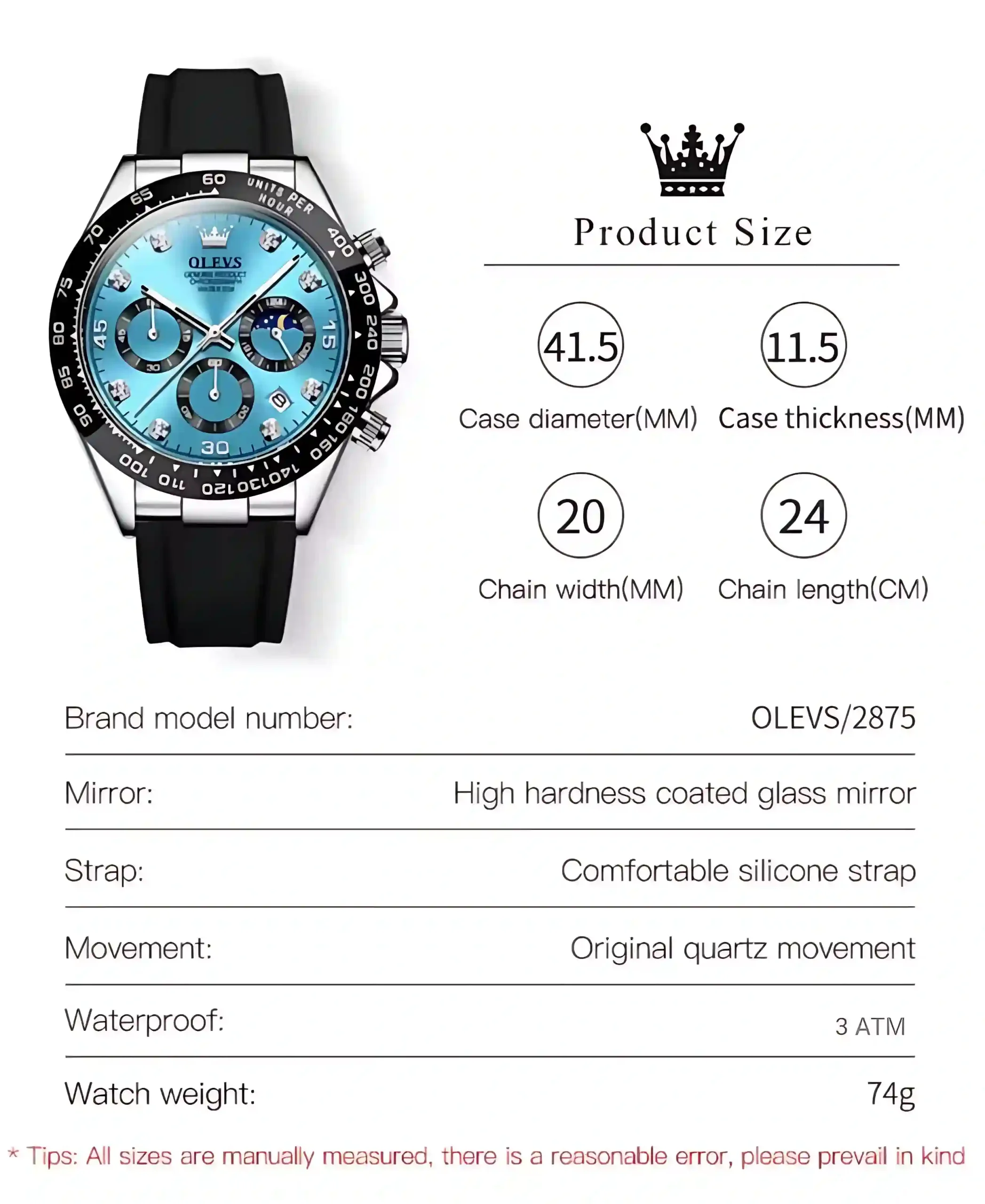 You choose the Olevs 2875 Men Chronograph because it delivers advanced chronograph features with a sleek, durable build. The original quartz movement ensures accurate timekeeping. Its silicone strap adapts to your wrist for all-day comfort. The 3 ATM waterproof rating protects against splashes and rain. Whether you’re heading to the office or the gym, this watch keeps up with your pace and style. It represents the innovation and reliability of Olevs.