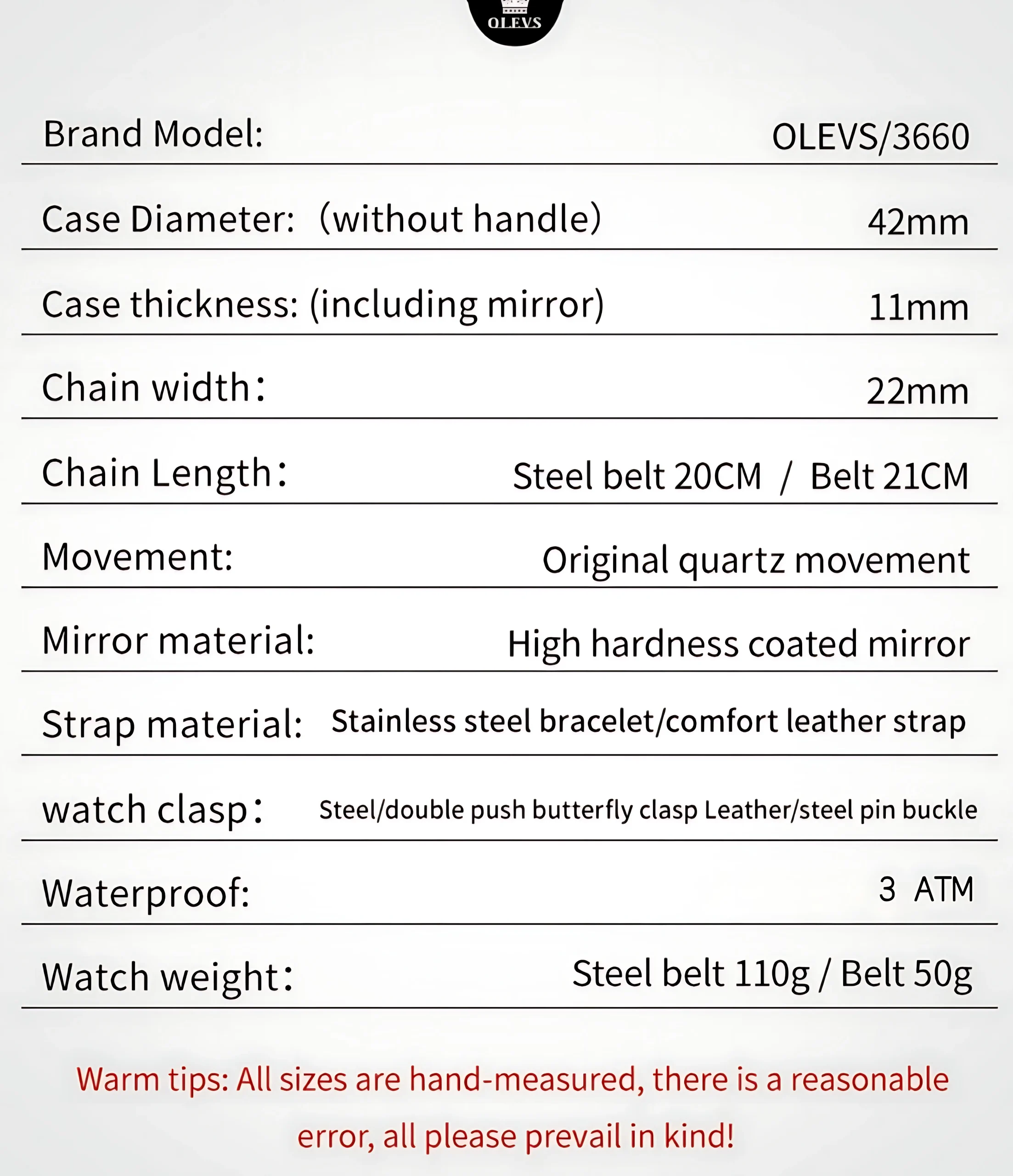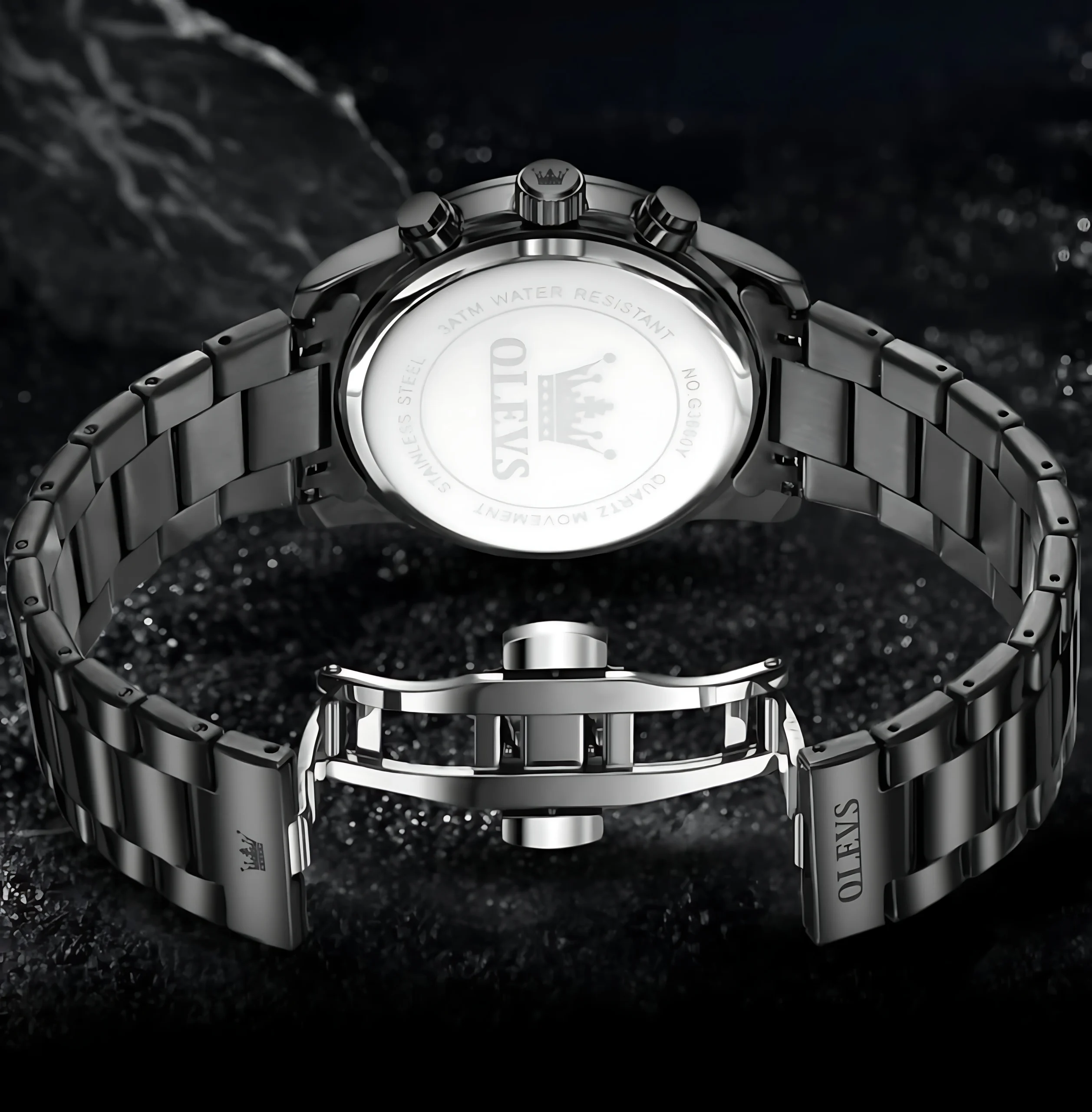 ANS : Yes, the OLEVS 3660 is water-resistant up to 3 ATM (30 meters), suitable for daily wear, hand-washing, and light splashes—but not for swimming or bathing.