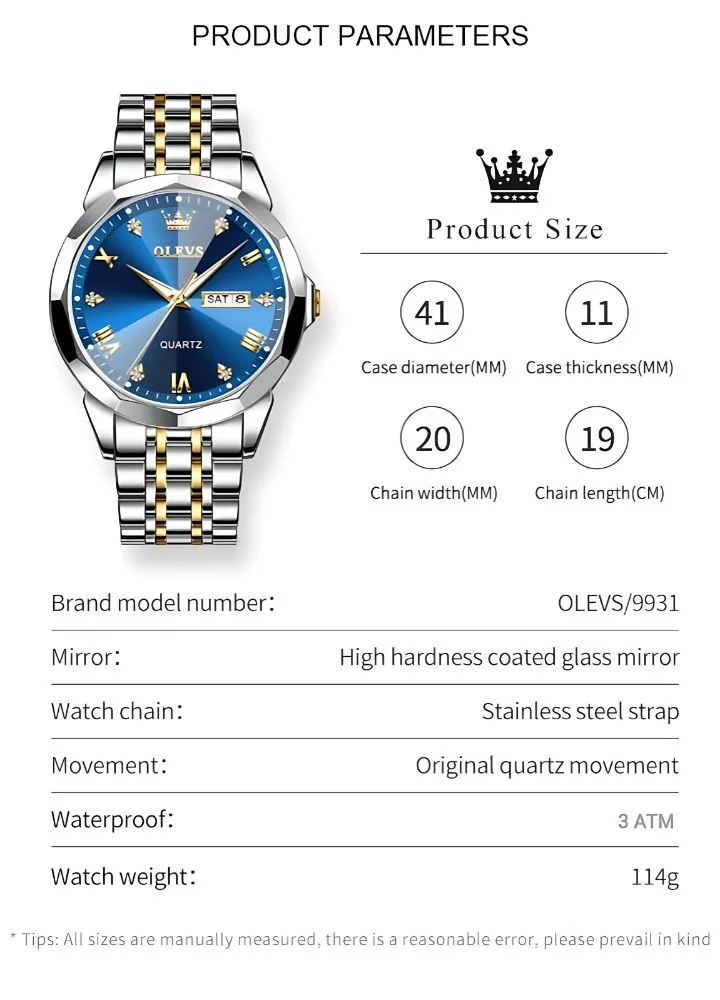 This watch stands out because it merges premium craftsmanship with practical features. The day and date display ensures utility beyond standard timekeeping, while the coated mirror enhances durability. The stainless steel strap with dual‑tone finish provides both style and comfort. Unlike ordinary watches, the Olevs 9931 Men Watch offers a balance of elegance, strength, and precision. Choosing this watch means choosing reliability, sophistication, and a stylish companion for every moment.