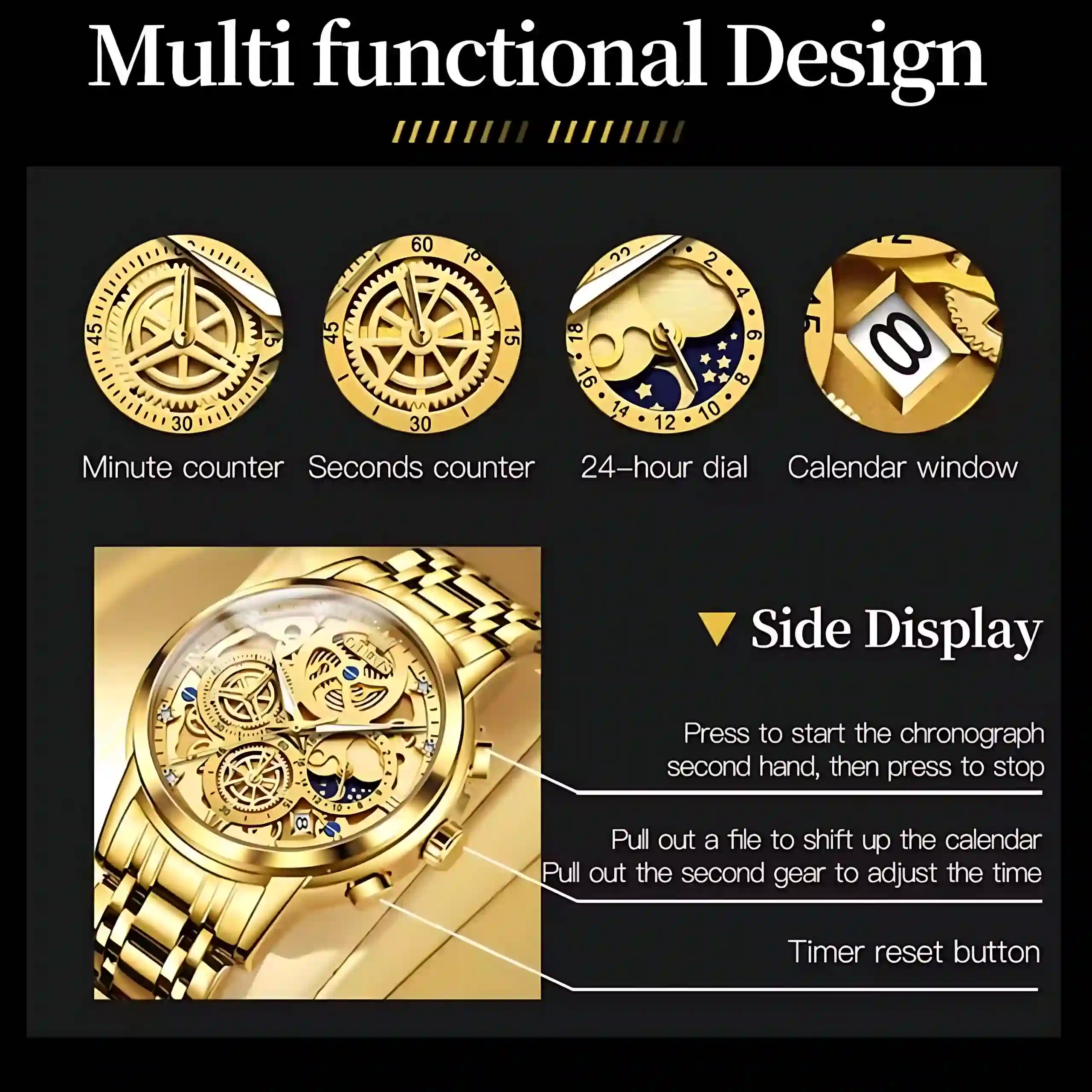 The Olevs 9947 Men Chronograph is designed for men who appreciate precision and luxury. Its gold dial with intricate chronograph sub‑dials delivers both functionality and elegance. The textured watchband ensures comfort and durability, while the high‑hardness coated glass mirror resists scratches and maintains clarity. Powered by original quartz movement, this watch guarantees accurate timekeeping. With its bold design and reliable performance, the Olevs 9947 stands out as a versatile accessory for both formal occasions and everyday wear.